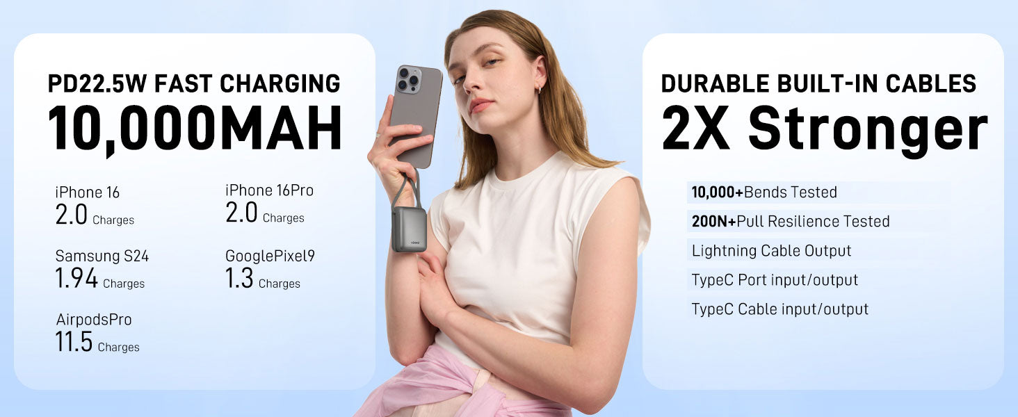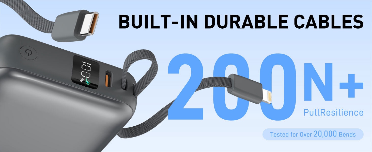 - Triple-Device Charging – Built-in Lightning & USB-C cables(in&out) + extra USB-C port, tested for 20,000+ bends.